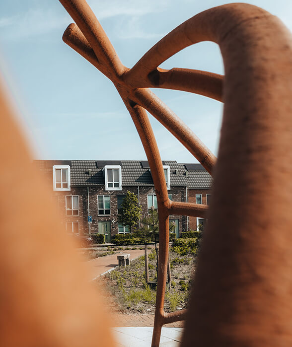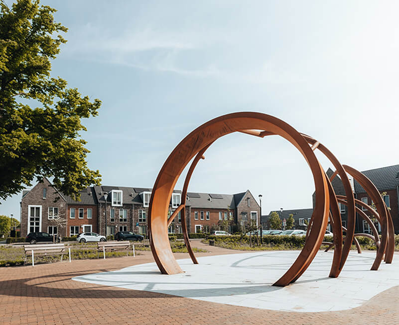 Inspired by the archaeological theme of the Contreie district, Jeroen Verdaasdonk (javydesign), in collaboration with MX3D, has created a distinctive structural art object for Vrachelsplein: a modern interpretation of a Roman Dolium. Traditionally used to store goods like grain, the Dolium’s cylindrical shape has been reimagined into an open, interactive structure where residents can walk through, sit, or gather.